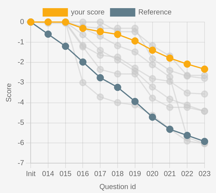 Figure 1 shows the data you would receive after participating in the quizz, with your score highlighted in yellow, the reference curve for comparison, and a sample of a few trajectories to compare against other humans. See how some curves are initially above the yellow line, indicating better performance, and later end up below the yellow line, due to lower scores on the later questions. There is also a grey line doing essentially no better than the reference.