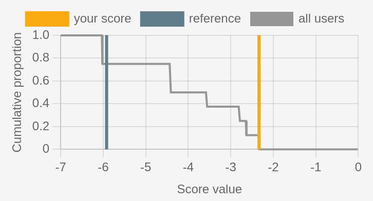 Final scores. Rather than checking cumulative score after each question, we can simply look at the final score numerically, presented as a cumulative distribution in Figure 2. The reference score is (-5.9) and the yellow user’s score is (-2.3), which is the best of this group. A more positive way to express this score is as the number of points above reference, or here (R+3.6). We can see here that a score or (-4) would place a user in the top 50% of scores, and an improved score of (-3) would jump to the top 40%. Note how about 20% of users have a score very close to the reference.