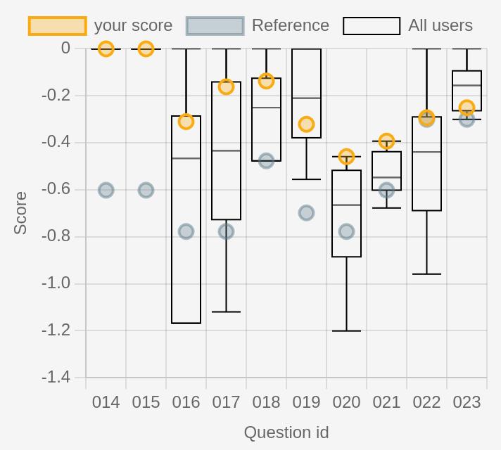 Figure 3 shows boxplots (median, quartiles and max/min) of the scores for each question. As expected from previous observations, Q14 and Q15 have all humans answering correctly, with a reference score of (-0.6) because there were four possible answers. The questions are about the capital city of Belgium and Spain, understandably easy. On the other hand, Q16 is about the capital of Switzerland (Bern, but often confused with Luzern, Geneva, or Zurich) and indeed shows more than 25% of users below the reference. The corresponding reference score of (-0.8) indicates that there were 6 possible answers.