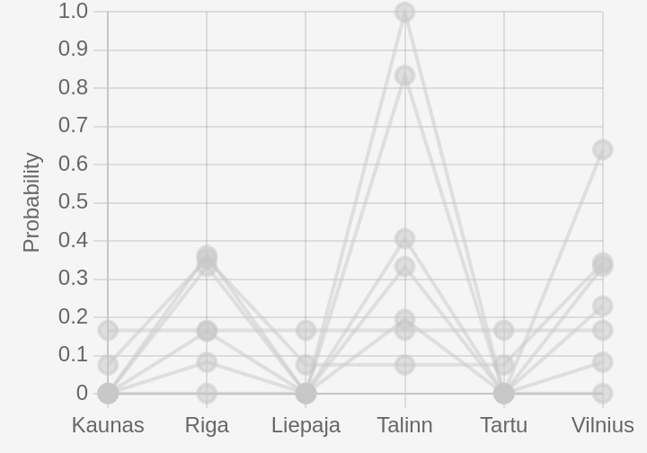 Answer patterns. Even on questions with typically-distributed scores, we can learn a lot from looking at individual probabilities selected. In Figure 4, we see a superposition of answers to a question about which of these cities in the Baltic States is the capital of Estonia.