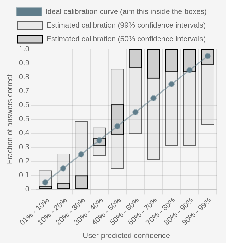 Instead of plotting the exact proportion of correct answers in each group, which tends to lead to calibration curves that are much less smooth that the ones presented in Figure 5, we can resort to confidence intervals which tend to give smoother pictures.